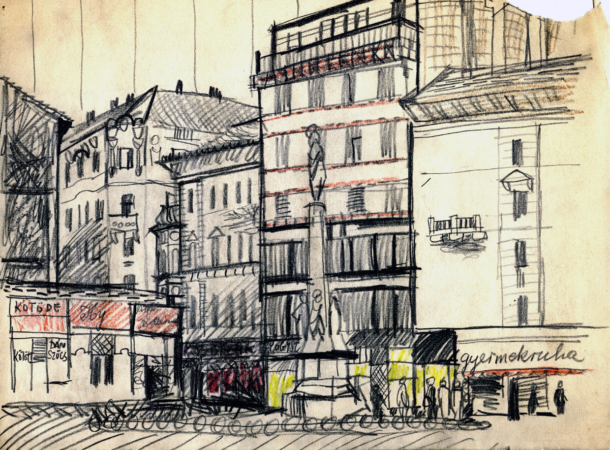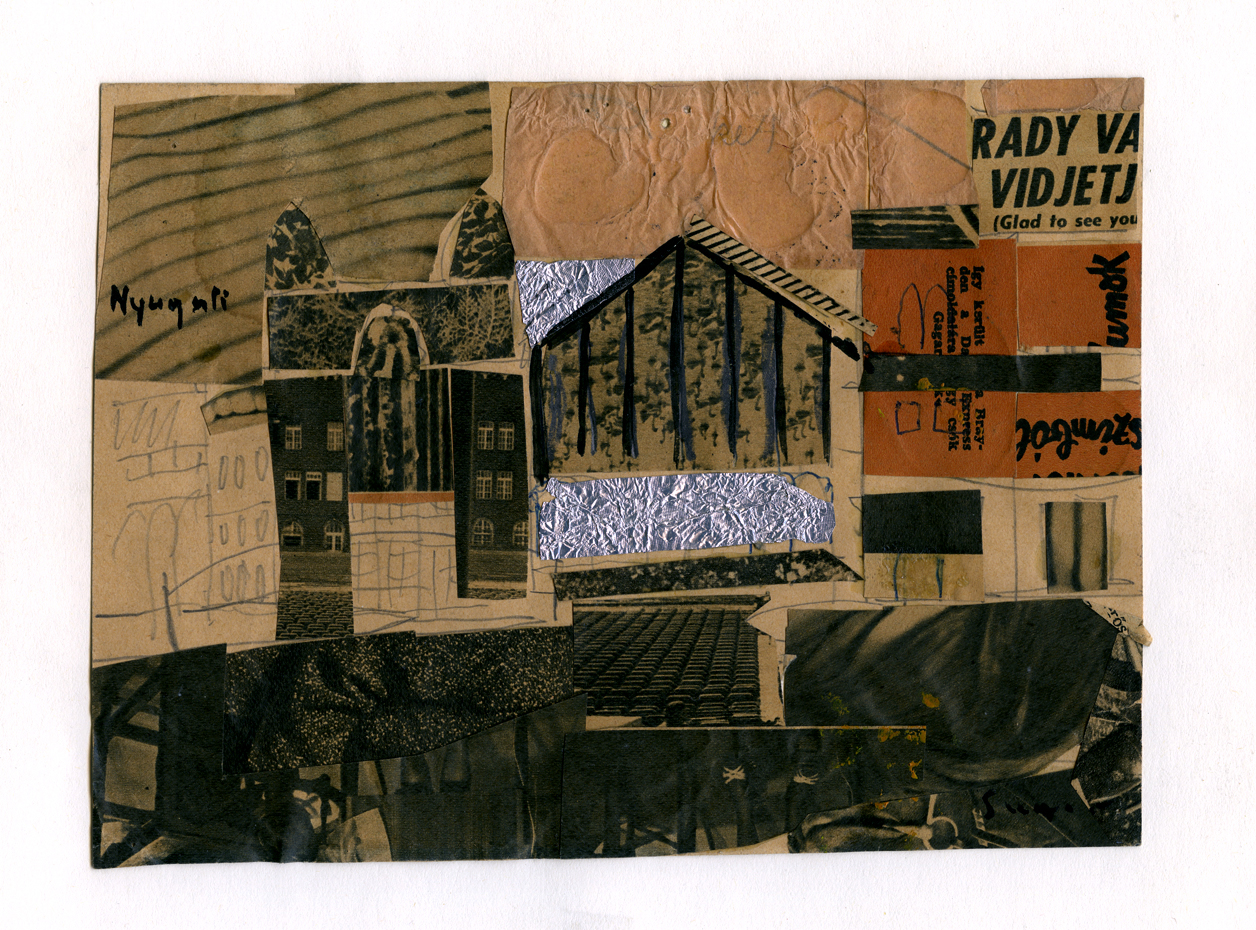 SU266 S.János küldte 2017.10., közlései: [nyugati pályaudvart ábrázolja] 60-s évek, kollázs, 13x18 cm., "alapja egy ceruzarajz, egy városképhez készített vázlat" nagy méretben
