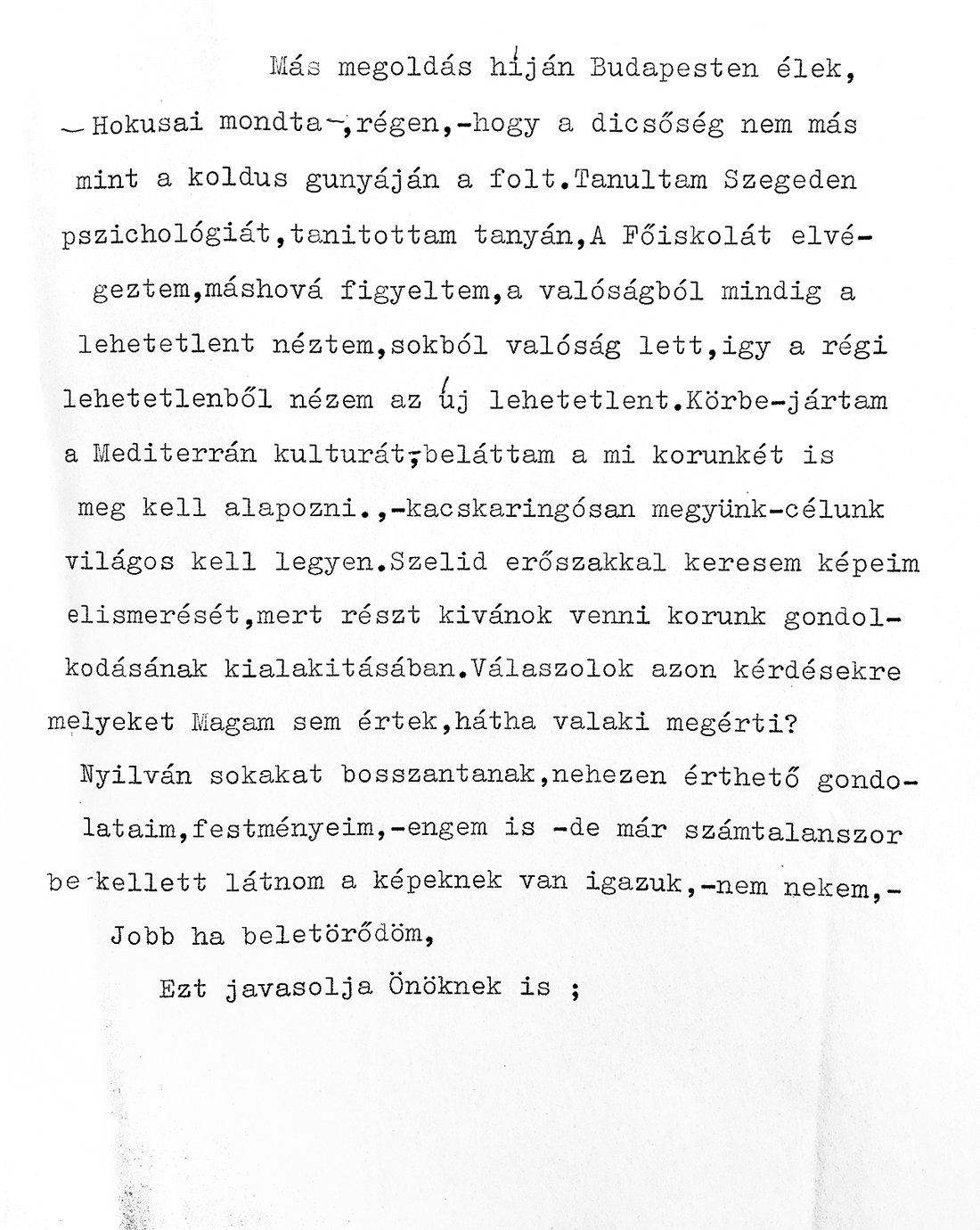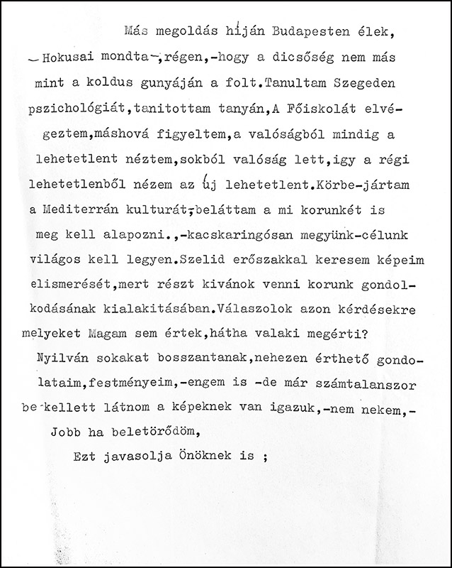 ASU021 Sugár Gyula saját szövege utolsó kiállításához, autográf kézirat, 1987-88 körül. S. János küldte 2017.10. nagyobb méretben