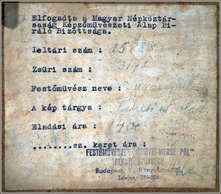 ASU003 SU01 festm. hátoldalán cédula: Elfogadta a Magyar Népköztársaság Képzőművészeti Alap Bíráló Bizottsága. Leltári szám: 15888, Zsűri szám: 3194, Fm. neve: S.Gy., A kép tárgya: Falusi út, eladási ára: 1400, ...sz. keret ára:... , bélyegző: FESTŐMŰVÉSZEK "SZINYEI MERSE PÁL" ALKOTÓKÖZÖSSÉGE, BP.V. IRÁNYI UTCA 26. t: 386-306 /S. János küldte 2017.10