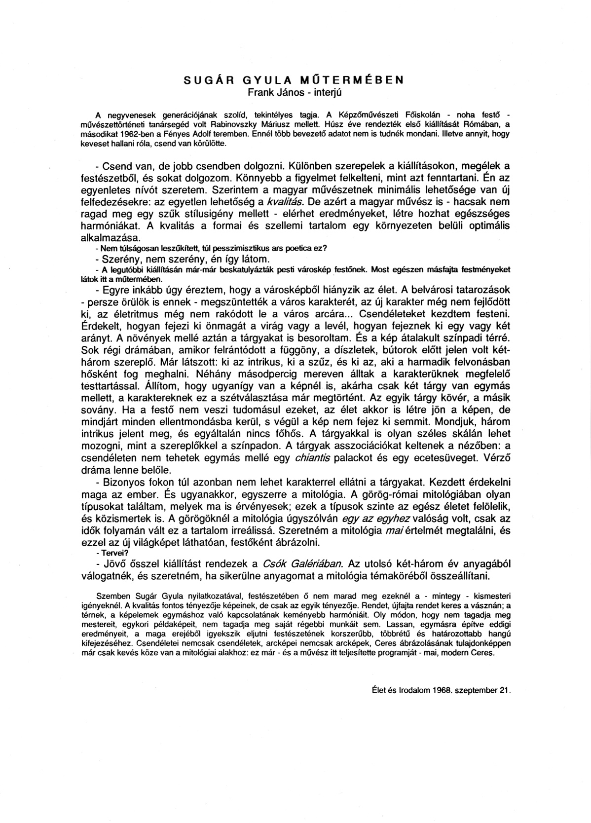 ASU004 Frank János interjú, S: Gy. műtermében 1968.09.21. Élet és Irodalom, // a városképek befejezése után csendélet és a mitológiai témákról, S. János küldte 2017.10.