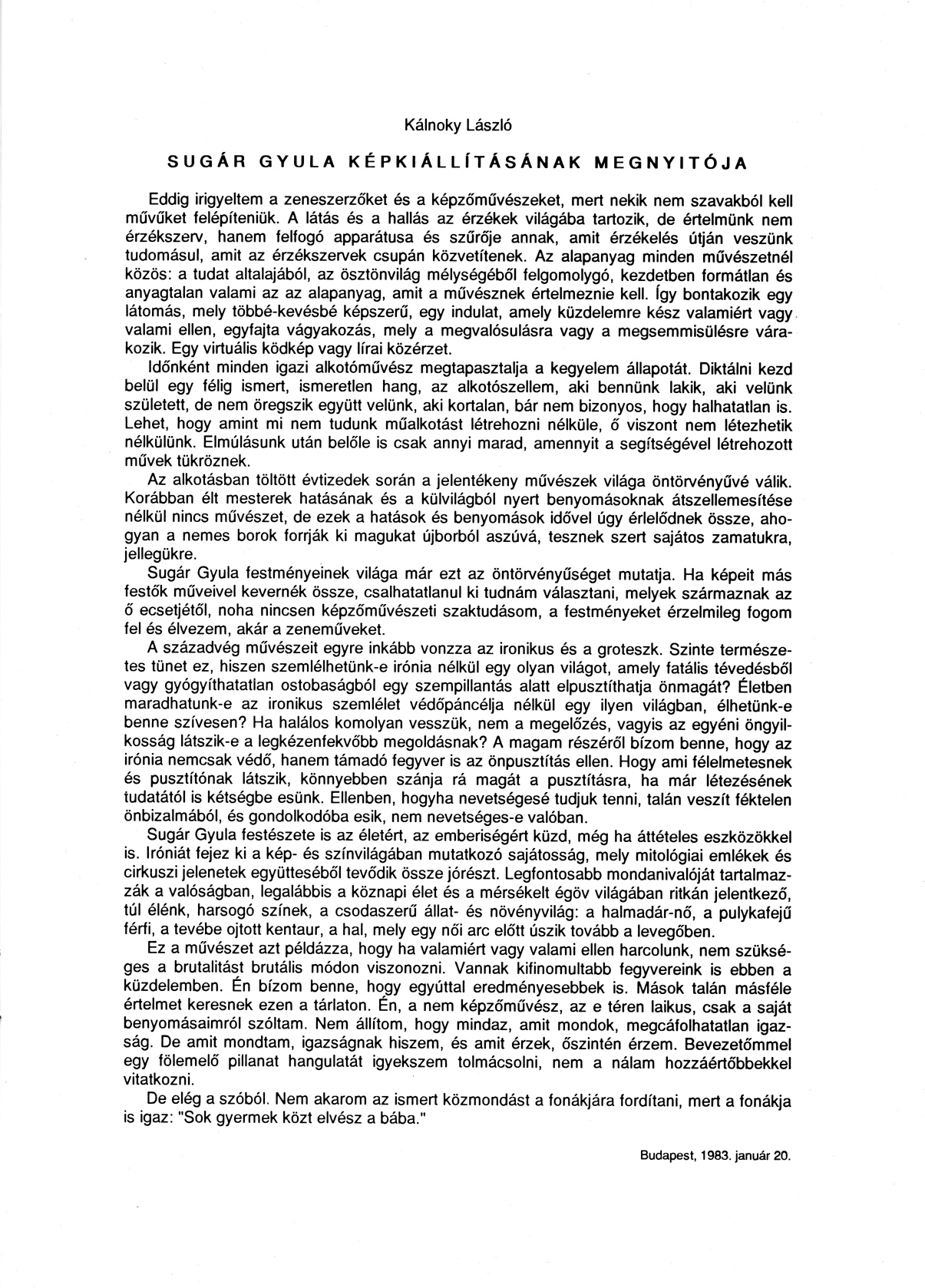 ASU005 Kálnoky László: S. Gy. képkiáll. Csók Istán Galéria; megny. szövege. Bp. 1983.01.20. // Irónia, groteszk szerepéről, a mitológiai, cirkuszi elemek, S. János küldte 2017.10.