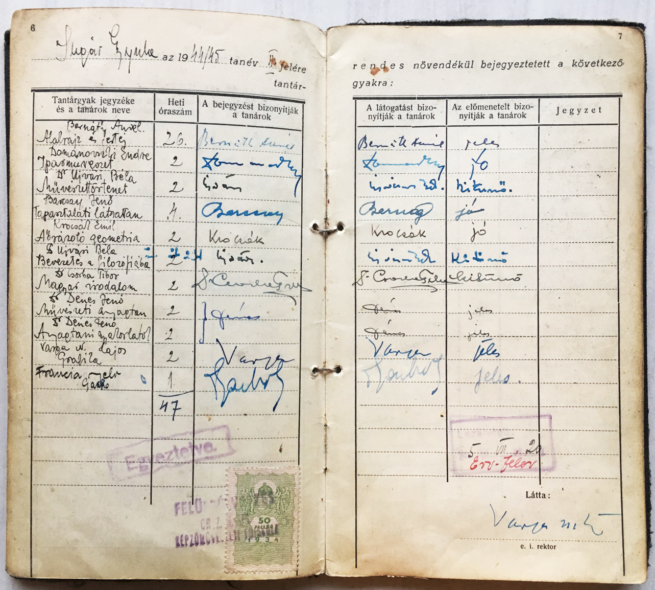 ASU010 Főiskolai bizonyítvány 1944-45 II. félév 1945. júli. 20. // heti óraszám 47.