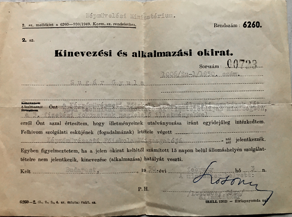 ASU015 Szakoktatói kinevezési okirat a Képzőművészeti Főiskolára 1950. febr., S. János küldte 2017.10.