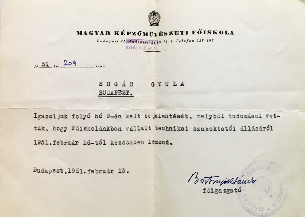 ASU016 Képzőművészeti Főiskola technikai szakoktató állás lemondása 1951. febr. (a fejlécben az Andrássy út átbélyegezve), S. János küldte 2017.10.