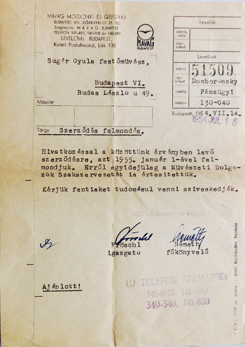 ASU017 MÁVAG szerződés felmondás 1954. július., S. János küldte 2017.10.