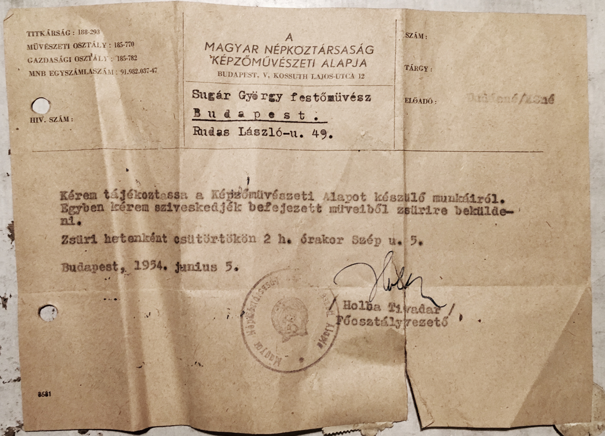 ASU019 Holba Tivadar Képzőműv. Alap ig., invitálja S.Gy.-t heti zsűrire munkákat küldeni. 1954.06.05., S. János küldte 2017.10.