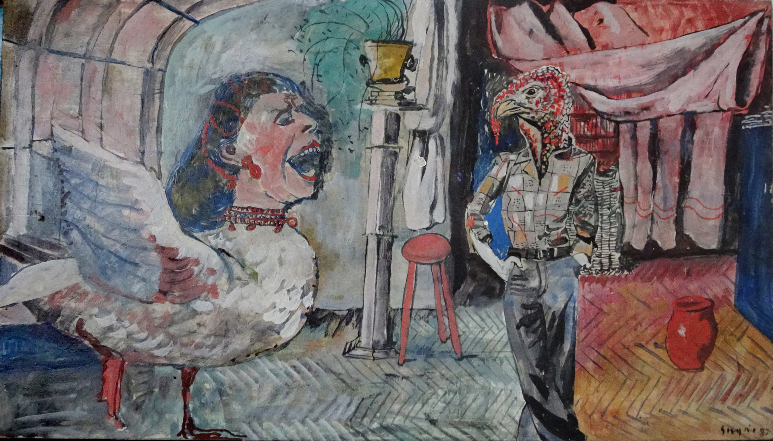 SU517 Romantikus madárvilág, olaj, farost, 63x83 cm., 1986 // Galéria Savaria